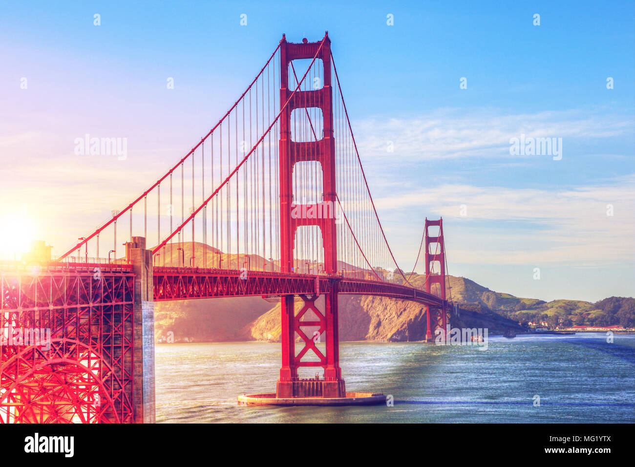 Vista Panoramica Del Golden Gate Bridge Di San Francisco In California Durante La Prima Sera Al Tramonto Con La Deliberata Lens Flare Il Ponte Di Pietra Miliare E Uno Foto Stock